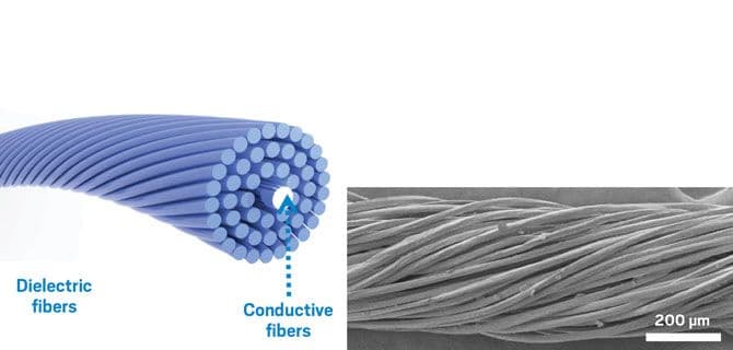 The yarn is based on a device Wang first developed in 2012 called a triboelectric generator, which takes advantage of static electricity that builds up from the friction between two different materials. The design is relatively simple, requiring a conductor (usually a metal) and a dielectric material (often a polymer), in close proximity. Dielectrics are insulators, but static charges can build up on their surfaces. When the two materials move closer together, electrons jump from the dielectric to the conductor. When they move back apart, those electrons flow into either a capacitor to store the charge or a circuit to generate power. These generators can harvest on the order of tens of milliwatts per square meter. That’s not a lot, but a triboelectric generator the size of a jacket could make 100 mW just from the wearer’s fidgeting—enough to power small sensors or to send a burst of data to receivers a few hundred meters away.