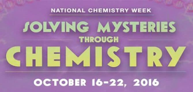 Each year, we set aside a week in October to reach out and share positive messages about the transformative power of chemistry. Welcome to Chemistry Week 2016! This year’s theme is “Solving Mysteries Through Chemistry.”
