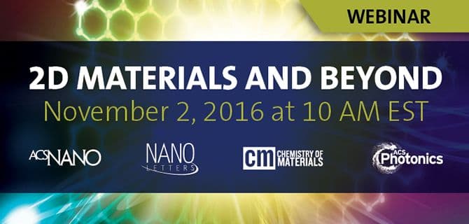 Interested in learning about the future of 2D materials and their applications? Join ACS editors on November 2, 2016 at 10 a.m. (EST) for an hour-long free webinar. You’ll hear from ACS Publications Associate Editors Mark Hersam of ACS Nano, Jeanie Lau of Nano Letters, Kian Ping Loh of Chemistry of Materials, and ACS Photonics Editor-in-Chief Harry Atwater. You’ll learn all about new research in 2D materials beyond graphene. These important discoveries have applications in a wide variety of sectors, including electronics, sensors, lightweight composite materials, photovoltaics, and medicine, as well as quantum dots, thermal management, and energy storage to name just a few.