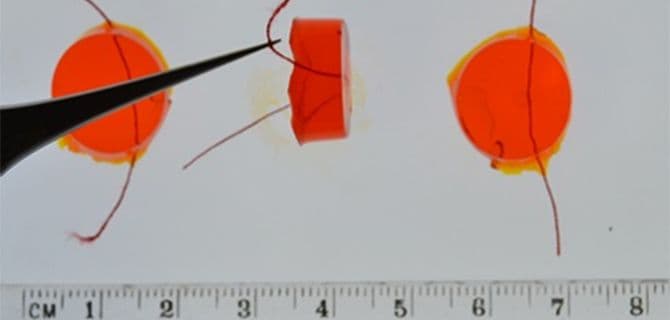 A. Toby A. Jenkins of the University of Bath and his colleagues wanted to provide an early warning of potential catheter blockage using a device that could easily be used in all existing catheter equipment. The researchers designed a double-layered polymer disk to release a fluorescent molecule in liquid with elevated pH.
