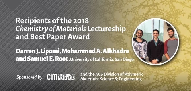 Chemistry of Materials and the ACS Division of Polymeric Materials: Science and Engineering (PMSE) are proud to announce Professor Darren Lipomi, Mohammad (Mo) A. Alkhadra, and Samuel (Sam) E. Root as the winners of the 2018 Chemistry of Materials Lectureship and Best Paper Award. The award honors the authors of an article, published in 2017, […]