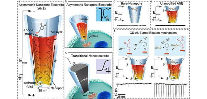 This novel signal-amplification mechanism, combined with the nanopore’s nanoscale dimension, could be potentially useful in doing high spatial- and temporal-resolution NADH detection inside living cells while minimizing the effects on cellular function.
