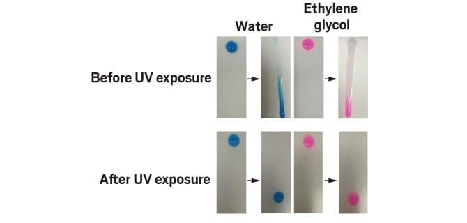 A slippery liquid-repellent coating is made of silicone oil-loaded microscopic capsules designed to break open when exposed to UV light. Blue-dyed water and red-dyed ethylene glycol stick to the coating before UV exposure (top, before and after tilting to 90°), but after UV exposure, the capsules release the lubricating oil that makes liquid droplets roll off the surface easily (bottom, before and after tilting to 10°).