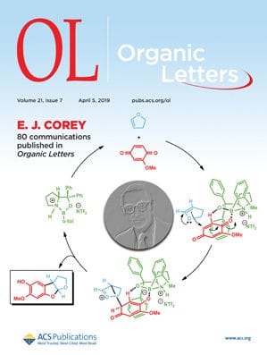 Professor Corey is featured on the cover of the April 5, 2019, issue of the journal in recognition of his many contributions to Organic Letters, including two Letters in the first issue published July 15, 1999, and publication of a total of 80 Letters over the past 20 years.