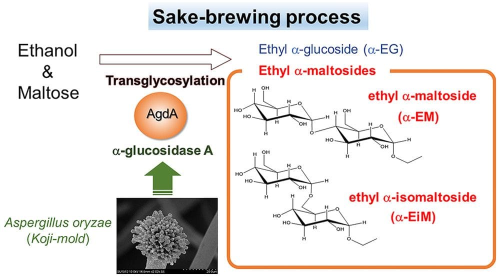 In this research article, the authors investigated the contribution of enzymes produced by the fungus Aspergillus oryzae in the saccharification process of brewing Sake, a Japanese rice wine. The (agdA) gene of Aspergillus oryzae coding for the a-glucosidase A enzyme, was knocked out to identify which components of Sake were produced by AgdA’s enzymatic activity. The results identified two novel transglycosylation products that were found to be present in many commercially available types of sake as well as in the natural environment.