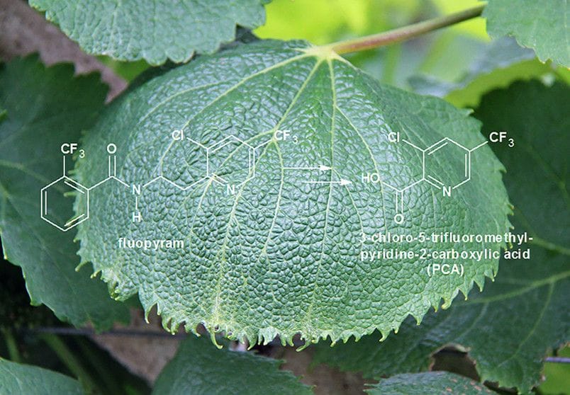In this research article, the authors identified and proposed a metabolite of the fungicide fluopyram, as the causing agent of phytotoxic damage on grapevines in the spring and summer of 2015 in several countries in Europe. Through greenhouse and field trials, the metabolite of fluopyram, PCA (3-chloro-5-trifluoromethylpyridine-2-carboxylic acid), was shown to cause leaf epinasty, impaired berry development leading to crop loss, and root-growth anomalies, similar to auxin herbicides in a dose-dependent manner.