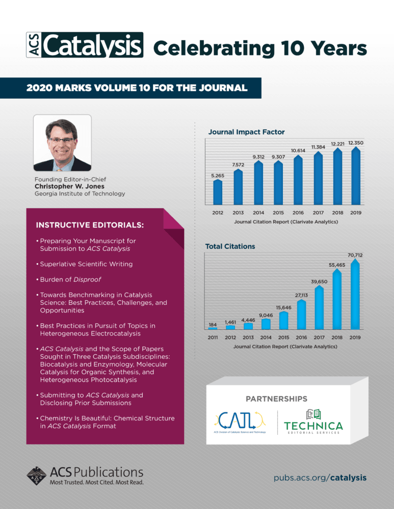 Founding Editor-in-Chief Christopher W. Jones played a key role in establishing of ACS Catalysis within the global community. The journal’s editorial board has grown from only two Associate Editors 10 years ago to 18 in 2020. These Associate Editors are supported by dozens of members of the journal’s Early Career Advisory Board and Editorial Advisory Board. ACS Catalysis published at least a dozen topical and regional specific Special Issues, Virtual Issues, and Virtual Special Issues. Accounts articles were introduced to highlight the careers in catalysis of top scientists and the ACS Catalysis Lectureship for the Advancement of Catalytic Science is entering its tenth year (co-sponsored by the ACS Catalysis Science and Technology Division).