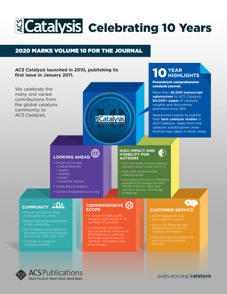 ACS Catalysis is thrilled to be celebrating its first decade of publishing! Since launching in 2010, ACS Catalysis has received over 25,000 manuscript submissions, leading to more than 60,000 pages of catalytic insights and discoveries published since its inaugural issue in 2011.