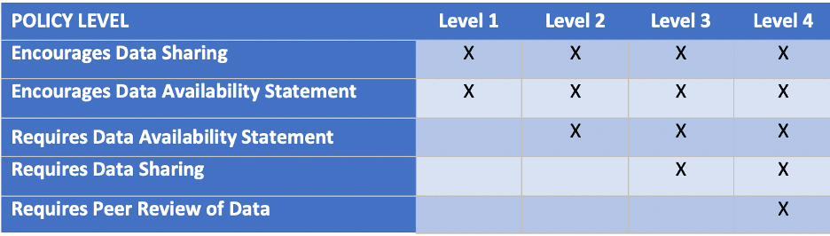 The Research Data Policy will be shared on the ACS Publishing Center on September 30, 2021. Though the policy outlines four possible levels of compliance (see figure below), all ACS journals will start at level one, in which authors are encouraged – but not required – to share their data.