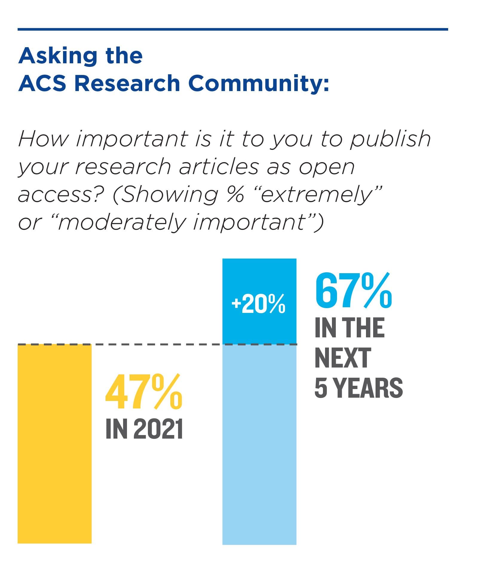 The survey also showed that more than two-thirds of respondents believe that publishing open access will be important within the next five years, with a preference for publishing in journals that include a mix of subscription-based and open access content in order to reach the best audience for their work. These ‘hybrid’ titles include ACS’ portfolio of more than 60 transformative journals, with their commitment to publishing an increasing proportion of open access content with the goal of eventually transitioning to 100% open access.