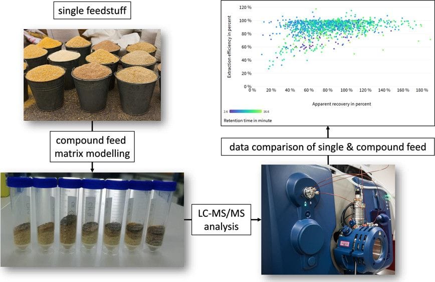 In this research article, the authors investigated the contribution of matrix effects and extraction efficiencies to the overall performance of LC-MS/MS multiclass methods and proposed a fit for purpose validation protocol for complex feed matrices. The proposed approach is based on artificially prepared model matrices which ensures an accurate but not overestimated method performance and better reflects real-life conditions of complex feedstuff. Considerable analyte/matrix dependent differences between performance criteria for compound feed formulas and single feed ingredients revealed that requirements of future validation guidelines for feed should be extended and harmonized.