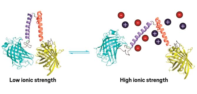 The researchers built molecules carrying a cyan and a yellow fluorescent protein, separated by two charged peptide helices. In a solution of low ionic strength, positive charges on one helix attract the negative charges on the other. The helices fold together like the arms of tweezers, drawing the fluorescent proteins at the tips close together. In a solution of higher ionic strength, ions surround the helices and neutralize their charges, keeping the helices, and thus the fluorescent proteins, separated.