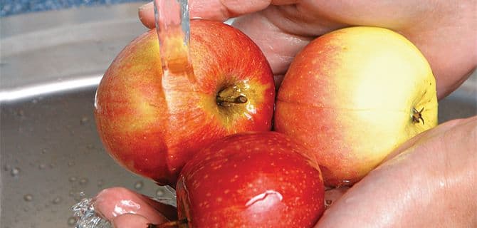 Rinsing produce with tap water removes germs and also significantly reduces pesticide residues. But some pesticides persist on produce after getting doused under the faucet, raising health concerns about chronic, low-level exposure to the compounds. A new study finds that a baking soda (sodium bicarbonate) wash can completely remove residues of two pesticides from the surface of apples.