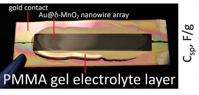 A battery built from manganese-dioxide-coated gold nanowires and a polymethyl methacrylate gel electrolyte has endured being recharged more than 100,000 times and is still going strong, researchers report. Switching from a liquid electrolyte to a gel appears to have been the key, but it is still unclear why the gel extends the battery’s life from between 2,000 and 8,000 charges to more than 100,000. One theory is that the gel plasticizes the manganese-dioxide layer and keeps it from breaking, but more tests are needed.