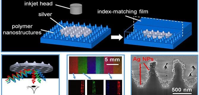 Researchers have found a way to add iridescent colors to nanopatterned polymer sheets using ink containing silver nanoparticles. An inkjet printer is used to apply an alcohol-based ink carrying the nanoparticles, with small variances in a pattern stamped into the polymer determining the color. The ink-coated pattern produces the different hues by interfering with specific wavelengths of light, resulting in more durable, fade-resistant colors that could be used to authenticate important documents such as passports.