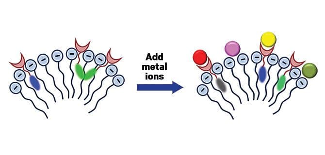 When metal ions are added to the solution, they bind to the metal receptors and interact with the anionic detergent molecules, changing the size and shape of the aggregates. This structural change in turn increases or decreases the intensity of fluorescence at each of the four wavelengths. Combining the changes at different wavelengths generates a recognition pattern for a particular metal ion, says Ding. The pattern of changes varies for each metal.