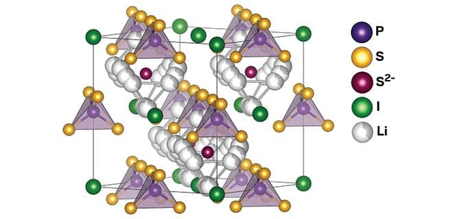 The material in question is an agyrodite, a class of lithium thiophosphates whose crystalline structure seems well suited to the movement of lithium ions. The researchers knew that the structure could be tweaked to make the ions flow even more easily, and they believe the material could be adapted to large-scale production. The researchers wanted to see if they could increase the ionic conductivity of one agyrodite, lithium phosphorus germanium sulfur iodide, which has the worst conductivity in its class. They replaced some of the phosphorus atoms with additional germanium which has a +4 charge compared with phosphorus’s +5 charge. That allowed the researchers to add more positively charged lithium to the material to balance its charge, increasing the number of charge-carrying lithium ions in the battery.
