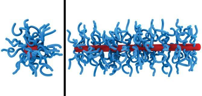 The researchers made three different fuzzy polymer nanoparticles that mimic bacteriophages: an 8-nm-wide sphere, and two 7-nm-wide rod-shaped particles that were 18 nm and 70 nm long, respectively. They built particles containing a polymer core with hundreds of bristles composed of positively charged, hydrophilic poly(4-vinyl-N-methylpyridinium iodide) sticking out. By using only hydrophilic bristles, the team hoped to avoid the antimicrobial peptides’ toxicity to mammalian cells.