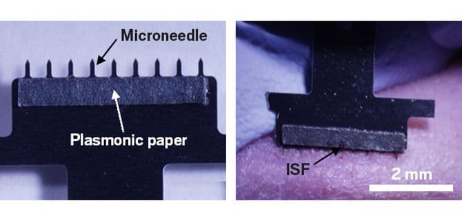 One day doctors might replace some blood tests with a small microneedle skin patch followed by a quick scan of the sample. As a step toward that goal, researchers have demonstrated a simple prototype device that combines microneedles and sensor-laden paper to sample fluid from below the skin. The researchers can directly detect a dye infused into rats by collecting interstitial fluid with the device and analyzing it with surface-enhanced Raman spectroscopy (SERS).