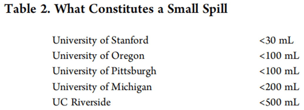 注:关于泄漏量的区分其实并不很明确,下图是文章中给出的一些机构中关于食人鱼溶液泄露量的界定,供小伙伴们参考。需要提醒大家的是,20 ml 的食人鱼溶液就可能导致爆炸,因此勿以量小而不在意。