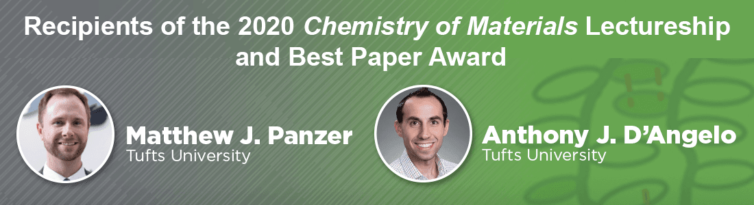 Chemistry of Materials and the ACS Division of Polymeric Materials: Science and Engineering (PMSE) are proud to announce that Anthony D’Angelo, Polymer Electrolyte Scientist at Ionic Materials Inc., and Matthew Panzer, Associate Professor in the Department of Chemical and Biological Engineering at Tufts University, are the winners of the 2020 Chemistry of Materials Lectureship and Best Paper Award. The award honors the authors of an article published in 2019 that has outstanding influence across the field of materials chemistry.