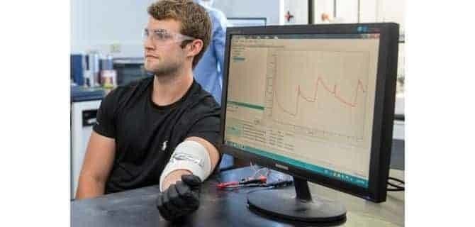 Researchers at Vanderbilt University developed a wearable device that generates electricity from low-frequency motions. The electrical current that it produces is displayed on a computer monitor. Credit: Pint Laboratory/Vanderbilt University/YouTube