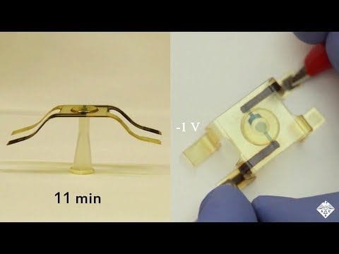 To make a self-folding device, the researchers alternate layers of the folding ink with rigid polyacrylate. By controlling different parameters such as the ratio of long and short polymer chains in the ink, the intensity of the UV light, the temperature of the curing step, and the thickness of the ink layer, the researchers could program particular folds into a printed object and control the folding angles within a few degrees. As a proof of principle, the group made a self-folding four-legged electrochromic device, which changes color in response to an applied voltage.