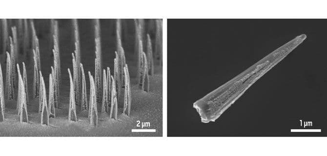 Xiaobin Xu, a researcher in Weiss’s lab, used lithography to make the nanospears—first by etching needlelike structures on a silicon wafer, then coating them with a layer of magnetic nickel, and following that with a coat of biocompatible gold. On top, the team layered organic molecules that can bind to biomolecules. The researchers magnetized the needles so that the tips would point towards a magnet, similar to how a compass needle swings to the north. After attaching biomolecules, they scraped the finished nanospears, about 5 µm long and 50 nm in diameter at their tips, from the silicon wafer.