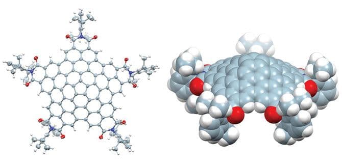 Organic chemist Frank Würthner and postdoctoral researcher Kazutaka Shoyama of the University of Würzburg came up with the method for synthesizing the nanocones, which are 1.68 nm in diameter and 0.432 nm tall. A five-atom ring of carbons forms the cone’s tip. The team used a cross-coupling annulation cascade to add hexagons around the edges of the ring until the molecule grew to 80 carbons. The team added five nitrogen atoms around the periphery of the cone, increasing the crystal’s solubility.