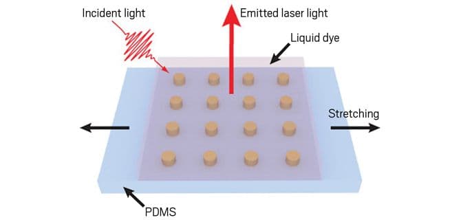 “A liquid gain medium is perfect for a stretchable device,” Odom says. “When you stretch the substrate, the liquid follows it perfectly so there are always molecules to amplify light for lasing.”