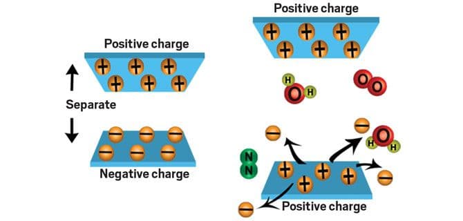 They also found that touching mica to the other positively charging inorganic materials or to organic surfaces, such as mica coated with organosilane groups or a sheet of polyethylene glycol diacrylate, left both surfaces with positive charges. When quartz contacted calcium fluoride, polystyrene, or polyvinyl chloride, both surfaces charged negatively. Touching quartz to mica, however, resulted in negatively charged quartz and positively charged mica.