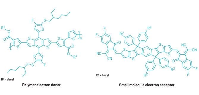 To address this, Hou tweaked the donor polymer, based on benzodithiophene, to be a better partner for IT-4F. By adding functional groups containing fluorine, he changed the energy of electrons that the polymer could donate, enabling electrons to hop more easily from the donor to the acceptor. “This is all done by chemical intuition,” says Ade.