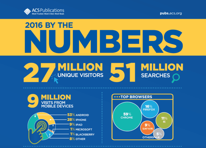 ACS Publications delivers more than 1 million research articles through its award-winning web platform. In 2016, those articles were accessed 94 million times. Discover more numbers behind the platform with this interactive infographic. Also, be sure to register for free article email alerts to be notified when new research is published in your favorite journals!