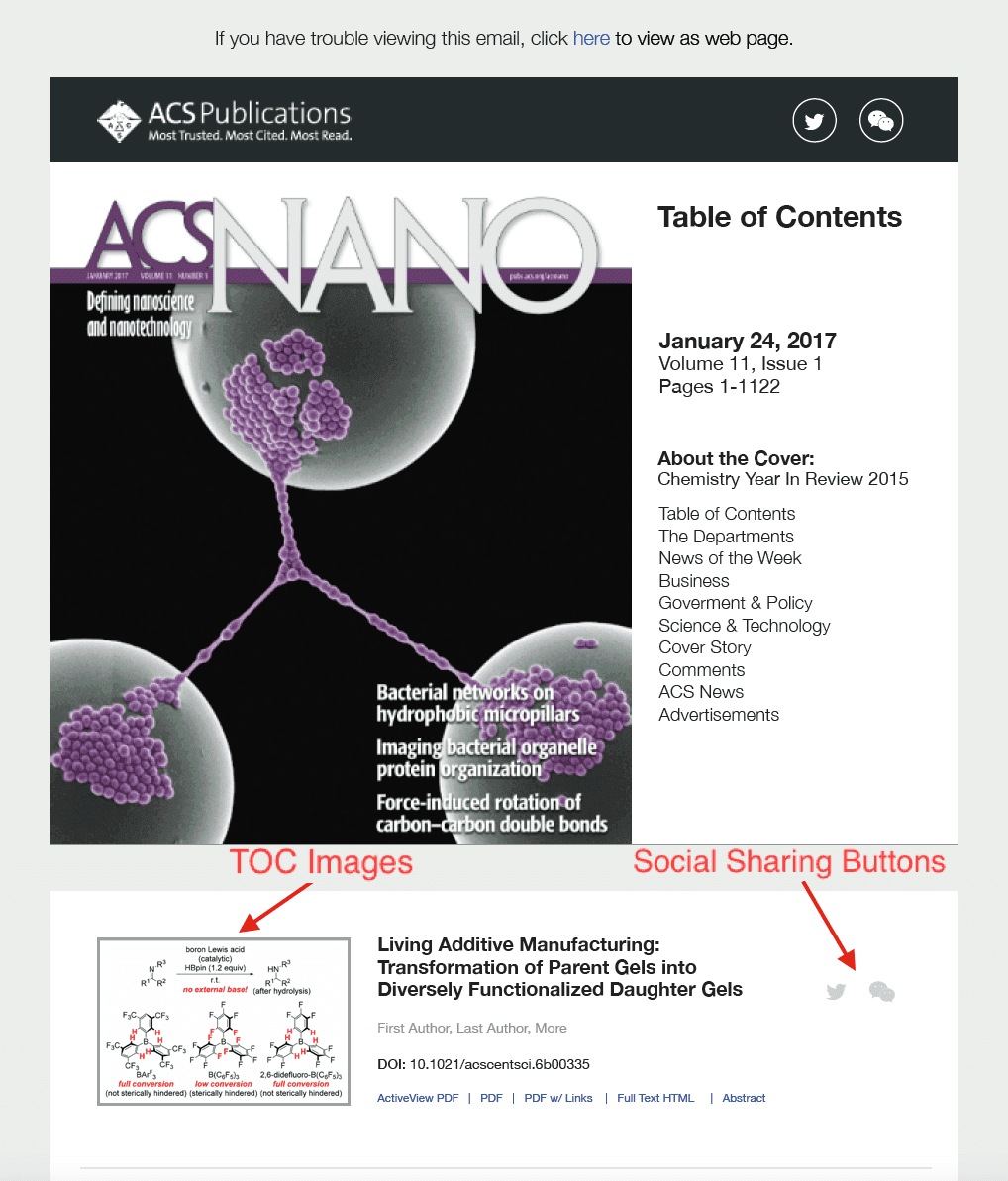 In an effort to improve the research experience for our global community, we made some welcomed enhancements to our TOC and Articles ASAP email alerts (e-Alerts) for all ACS Publications journals. In order to better serve the needs of our users, we have streamlined the design of these emails to more fully focus on showcasing the research articles. In addition to this new e-Alert design, there are a number of key features that are also worth noting:
