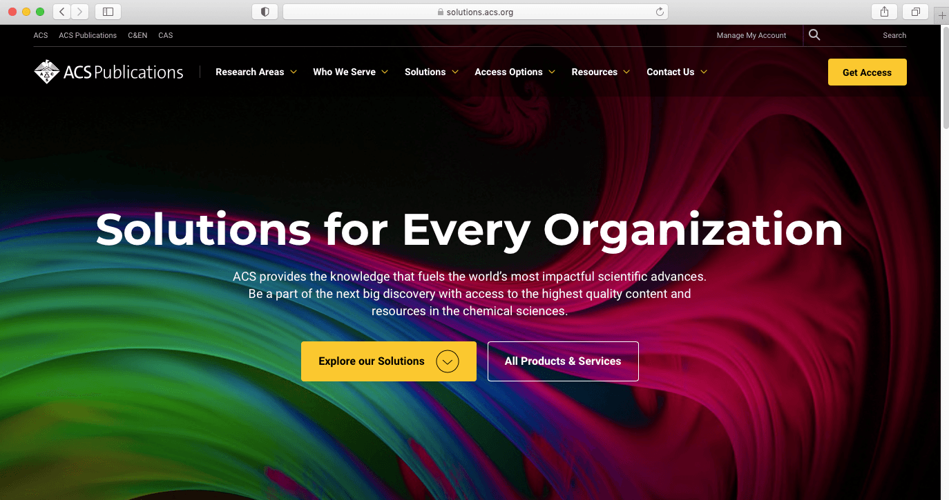 ACS Publications is very excited to announce the launch of the ACS Solutions Center, an online resource focused specifically on the various organizations that we serve. This new center, which replaces and improves upon content and tools that were previously available within ACS InfoCentral, provides insight into ACS Publications’ research areas, products, services, and access information for organizations. With this new resource, our goal is to deliver a dynamic digital experience that helps institutional purchase decision makers easily browse and self-educate about ACS Publications’ solutions based on their areas of interest and/or professional role. ACS Publications invites you to be a part of the next big discovery with access to the highest quality content and resources in the chemical sciences!
