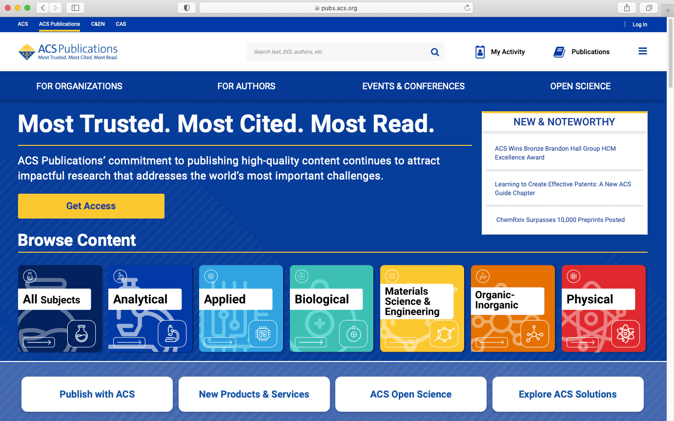 In addition, these improvements enhance the discoverability and accessibility of our full range of products and services, while offering navigation to our full suite of open access and subscription journal content. While the homepage of pubs.acs.org received a refresh, there will not be any changes to any of our journal homepages.