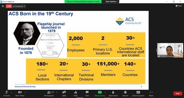 A significant feat in our collaboration with DST is manifested by the successful organization of the 10th DST & ACS workshop in 2021. This also marks the third consecutive year of the event. Three virtual one-day conferences were conducted. Collectively, over 3500 registrants, about 950 participants from approximately 300 institutes/universities across 25 countries were a part of these events. The event, live streamed on ACS Pubs Facebook page, garnered 1.1K views and reached out close to 4000 people over a period of 2.5 hrs. Despite the unprecedented times amidst the ongoing pandemic, the virtual events were phenomenal for their diverse speakers, exclusive content, pan-India outreach, and engaging panel discussions.
