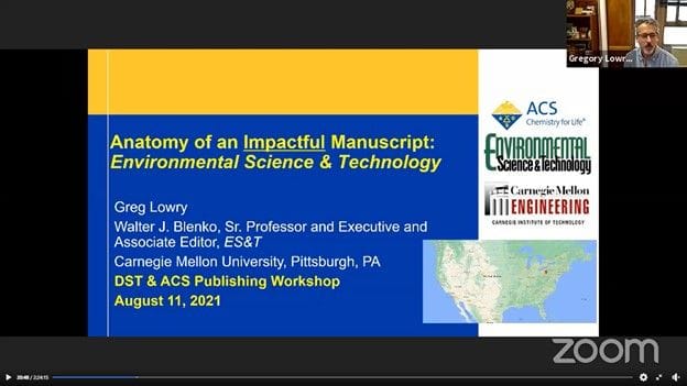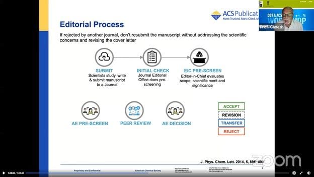 While guides to scholarly publishing hosted in the ACS Institute (https://institute.acs.org/) are generic, specific attributes are often essential when it comes to submitting a manuscript to a specialized journal. Therefore, the DST & ACS workshops advanced to yet another notable step in focusing on a specific broad subject domain. In this direction, the 9th & 10th workshops conducted in August and October were solely focused to deal with publishing specifically from environmental science & sustainable chemistry and materials domain, respectively. The speakers in attendance for these sessions included Prof. Greg Lowry (Executive Editor, Environmental Science & Technology), Prof. Sara Skrabalak (Editor-in-Chief, Chemistry of Materials & ACS Materials Letters) and Dr. Akhilesh Gupta (Senior Adviser/Head, PCPM Division, DST). Dr. Jim Milne (President, ACS Publications) delivered the opening remarks for the 10th workshop elaborating on some initiatives and programs in cognizance with ACS’s commitment to support the broader scientific community. A distinct addition to last year’s DST & ACS workshops is the session targeted to assist graduate students and postdocs with their poster presentation skills, mediated by Dr. Aditi Jain (Development Editor, ACS International India).
