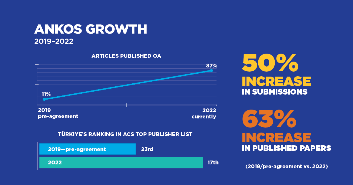 ANKOS, a Turkish consortium that includes 45 participating institutions, signed a read and publish agreement with ACS in 2022. Before the agreement, Türkiye was ranked 23rd on our list of top-submitting countries, but only 11% of articles on average from authors in Türkiye were published OA in ACS journals.