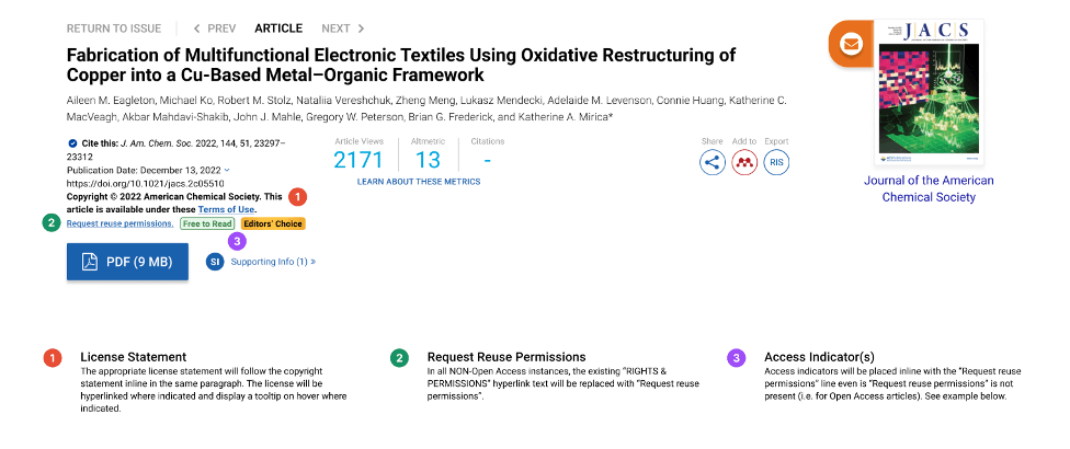 在此次更新中,所有发表在ACS期刊上的开放获取文章都将拥有一个清晰的“Open Access”标识,取代了此前的“ACS Author Choice”标识,并提供该文章所适用的知识共享许可以及相应的再利用权限。