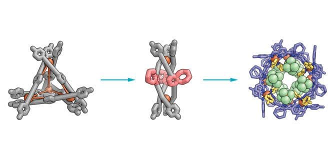 The Cambridge researchers, led by Jonathan R. Nitschke, first combined iron atoms and nitrogen-containing ligands to form a tetrahedral complex. Then they added cyclooctyne, which snapped onto a reactive portion in the center of each ligand. This modification slightly bent each ligand, enabling the complex to change its structure. Most of this modified tetrahedron morphed into a helical structure, observed with nuclear magnetic resonance (NMR) spectroscopy.
